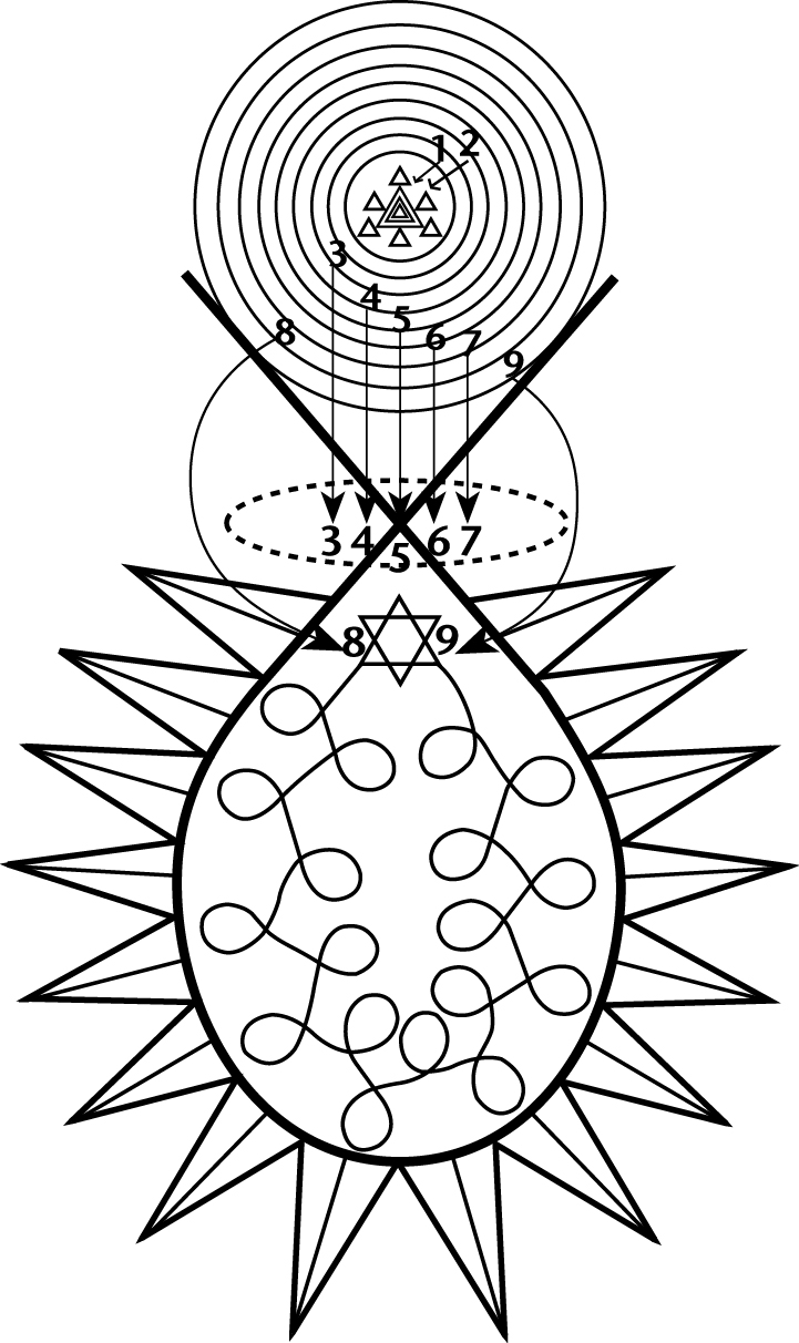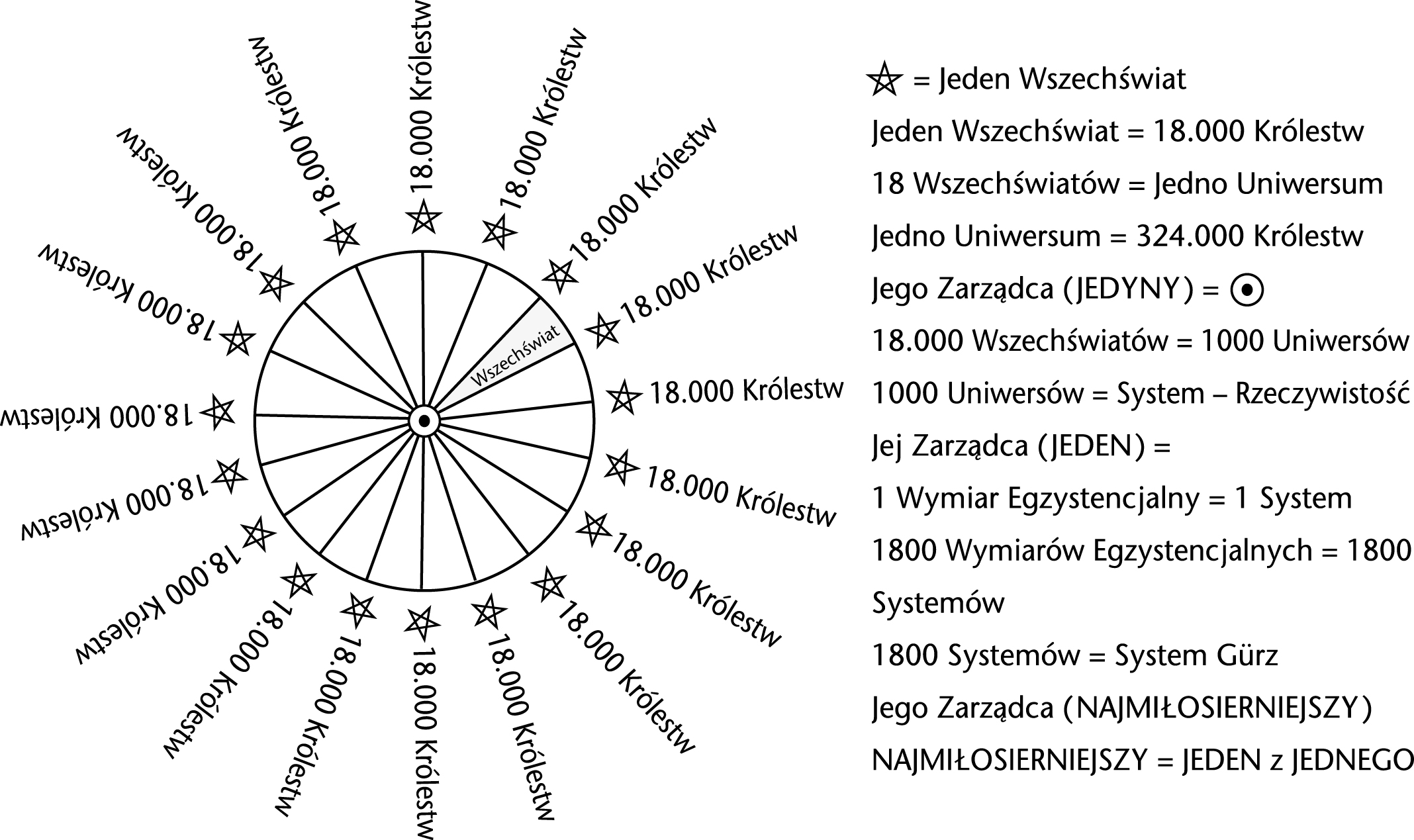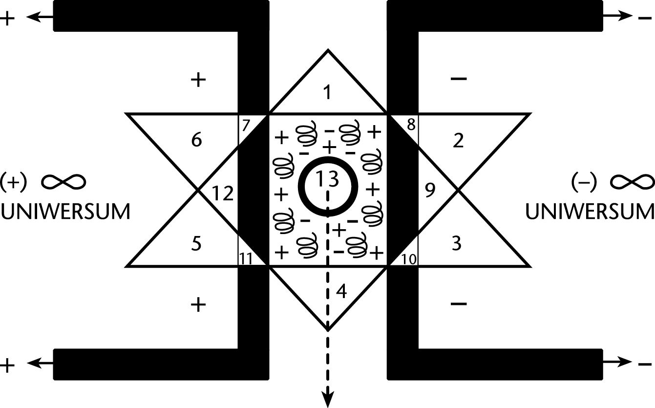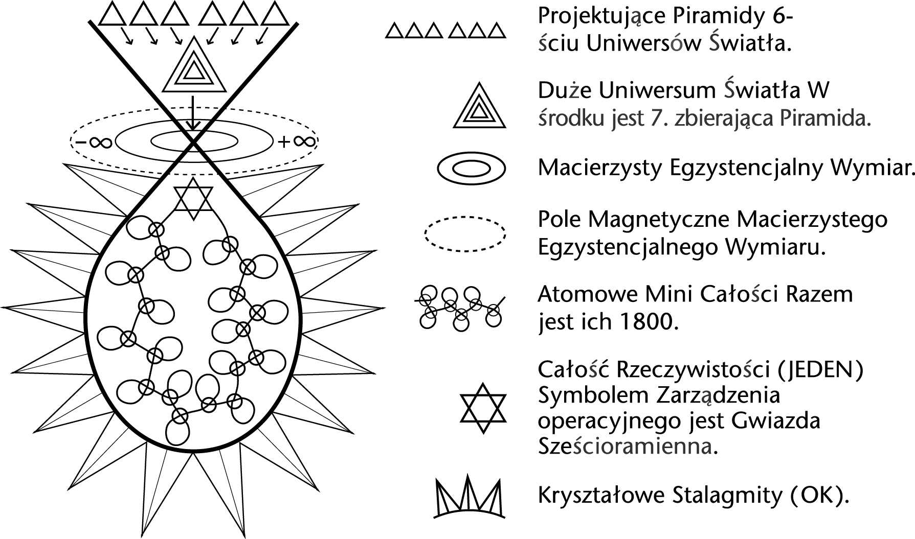 Na powyższym wykresie dwa przeciwstawne Uniwersa, oddzielając Energie Potężnego Punktu Ogniskowego, tworzą Atomową Całość i tworzą Pozytywne Nieskończone Uniwersum oraz Negatywne Nieskończone Uniwersum.